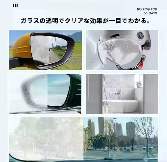 車用クリアガラス防曇コーティング剤|ヘルメットシールド・フロントガラス・サイドミラー専用防曇・除曇剤。